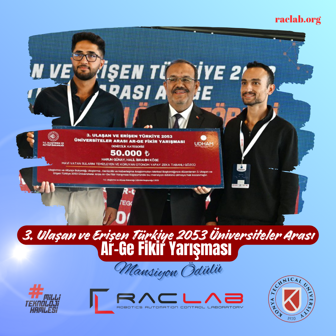 [EN] RACLAB students Harun Günay and Halil İbrahim Köse won the Honorable Mention – Most Creative Award at the “Accessible and Connected Türkiye 2053” R&D Competition of Ministry of Transport and Infrastructure with their project “An Autonomous AI-based Guardian Protecting the Blue Homeland.”