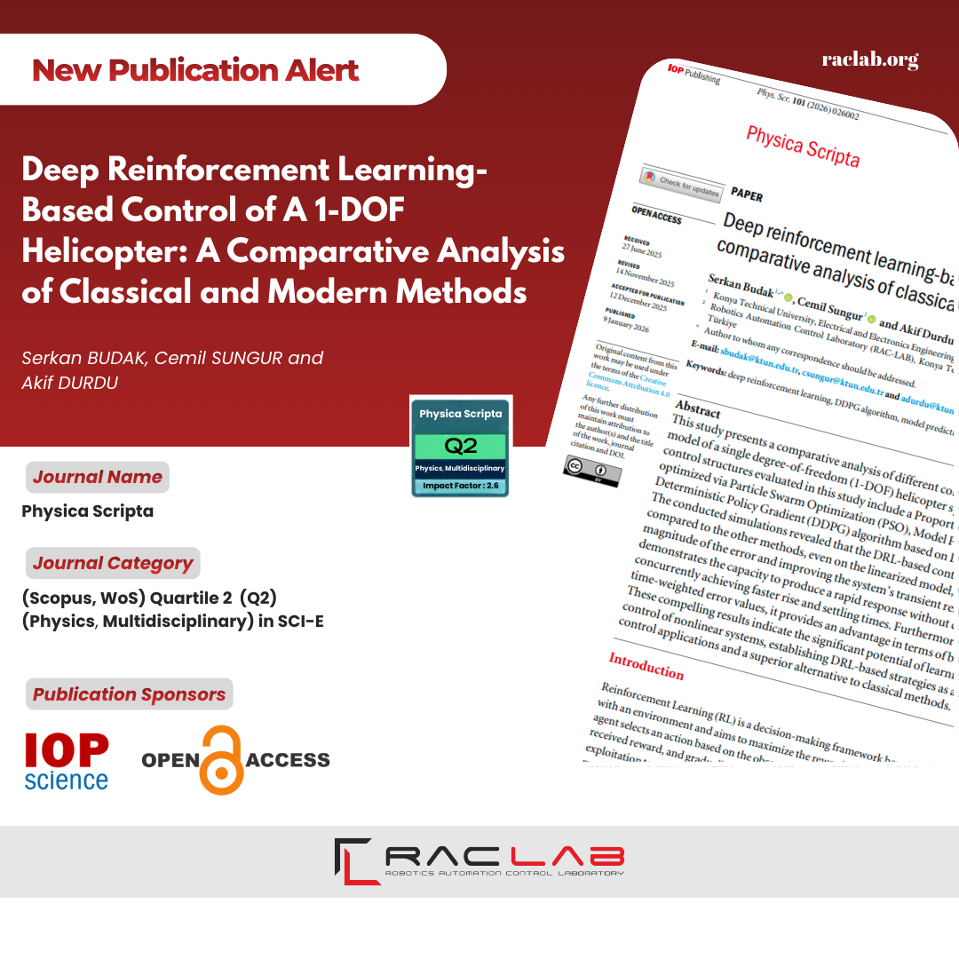 Serkan Budak, Cemil SUNGUR, Akif DURDU, “Deep reinforcement learning-based control of a 1-DOF helicopter: a comparative analysis of classical and modern methods” Physica Scripta, Volume: 101, Issue:2, 026002, Jan. 2026, doi:10.1088/1402-4896/ae2c22 (SCI-E)