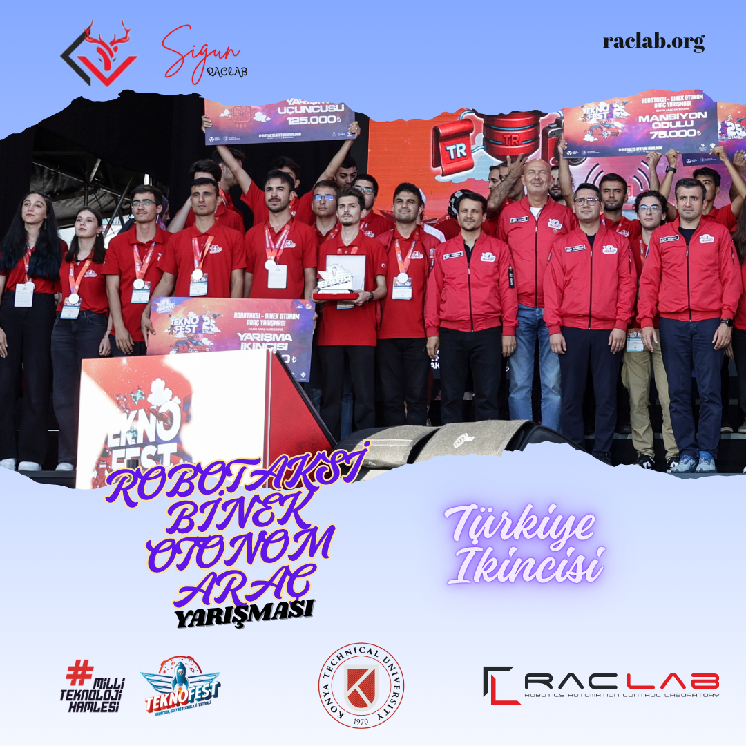 Teknofest 2025 Robotaksi Binek Otonom Araç yarışmasında RACLAB SIGUN (Burak Özsoy (Takım Kaptanı), Bahtiyar Erener KURT, Hasan Altuğ, Osman Melih Kocaoğlu, RECEP MAHMUT GÜNDÜZ, Şevval Eymen Nergiz, Fatmanur Çınar ve Enes Kurt) takımımız, Bilişim Vadisi’nde yapılan yarışmalarda Hem Türkiye İkincisi oldu hem de “En Özgün Yazılım” ödülü aldı. 💪